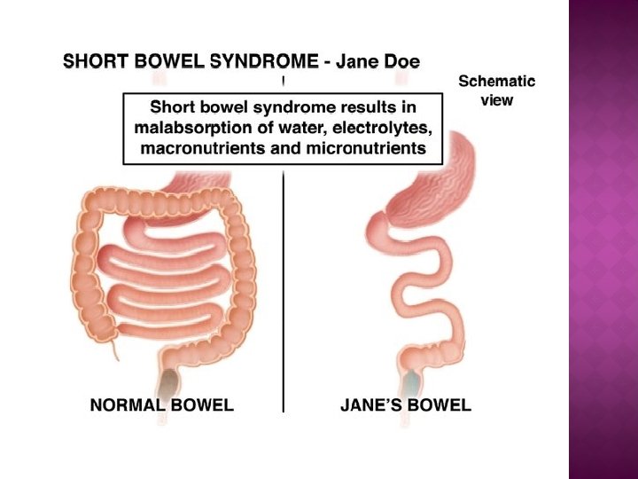 � Short bowel syndrome �Malabsorptive disorder that occurs as a results of decreased mucosal surface area Less absorptive area in intestines for fluid, electrolytes, and nutrients �Usually a result of extensive resection of the small intestine Necrotizing enterocolitis; born with insufficient amount of intestine leading to malrotation; cannot absorb enough �Pts need TPN to get sufficient nutrients �Patients on chronic TPN like this one, survival rates about 60% �Nutritional support greatest concern