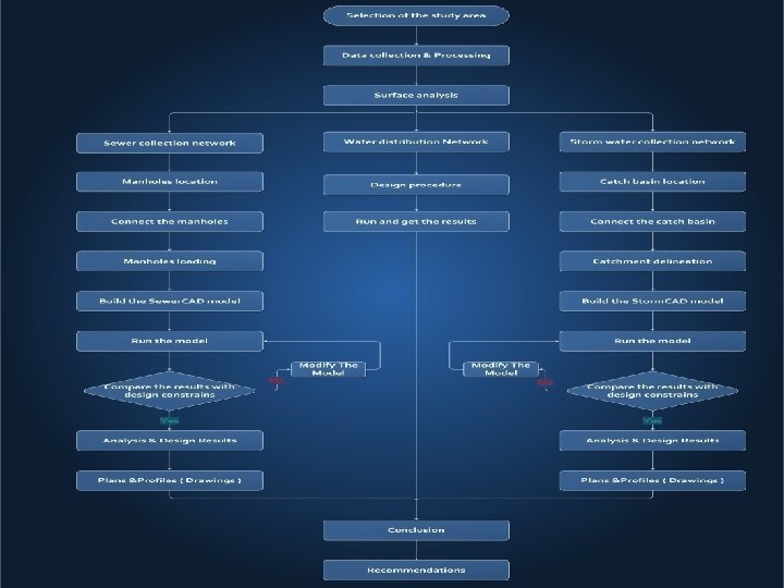 Recommendations �Site investigation must be done in order to the nature of the study area. �If possible treatment plant is considered as a feasible project. �We recommend to civil engineering department to but the Arc Hydro tools in GIS course plan, because it saves a lot of time, give more accurate results, and the design process will be easier.