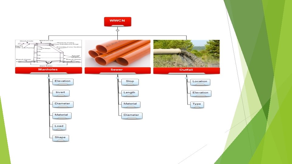 Design criteria The velocity : (0. 6 – 3 m/sec) The cover : (1 -5 m) The slope : (1 -15%) The distance between manholes are (30 -50 m)