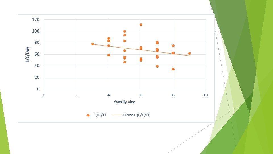 Questionnaire analysis avaerage consumption water Average family size = 5. 9 capita Average consumption = 11. 9 m³ So the water consumption = (11. 9*1000)/(30*5. 9)= 67. 2 L/C/day