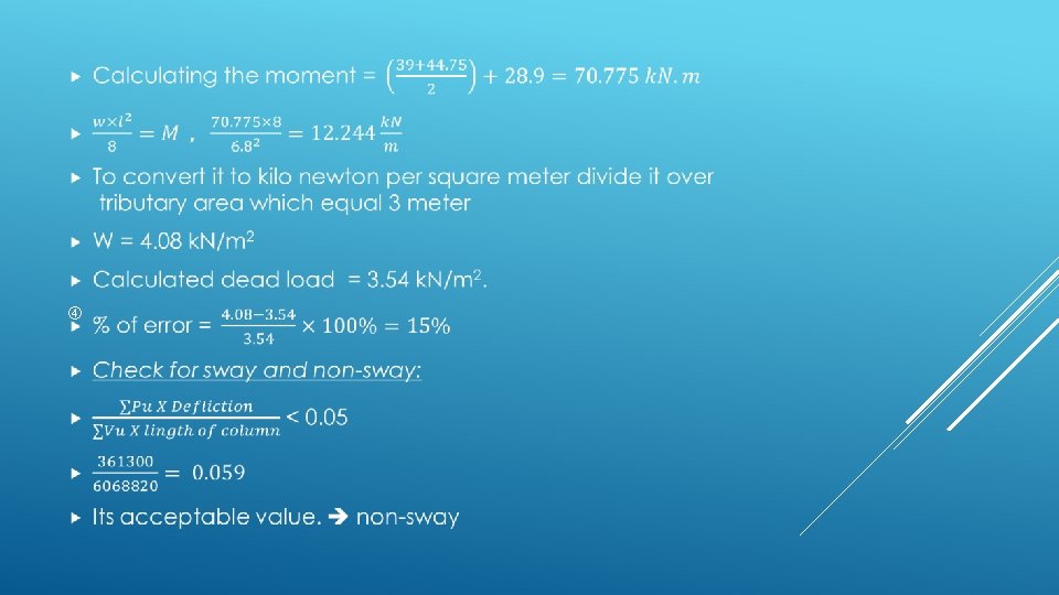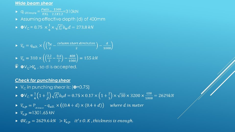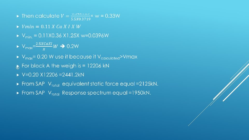 EQUILIBRIUM CHECK FOR BLOCK A Dead load: 1. Slab dead load = area X slab own weight per square meter =1185. 84 X 3. 54=4136. 4 k. N 2. Shear wall load = walls volume X concrete weight per volume = 28. 7 X 0. 3 X 15 X 25=3288. 75 k. N 3. Columns dead load = column volume X concrete weight per volume = 30 X 15 X 0. 4 X 25=1800 k. N 4. Beams dead load = beams volume X concrete weight per volume = 3691. 4 k. N 5. Total dead load = 12917. 6 k. N 6. Total dead load form SAP = 12956. 699 7. % Error = 0. 3% which is acceptable