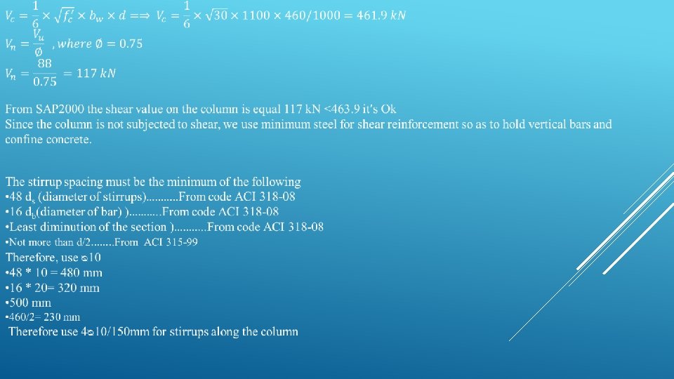 From SAP 2000 and 3 D-model we take Pu=8287 and it equal ��Pn then we go to the interaction diagram and take the steel ratio value= 0. 012 ��Pn/bh=15 ¥=h-2 couver/h = 0. 9 Mu/bh 2=1. 44 = 0. 2 ksi =2. 15 ksi