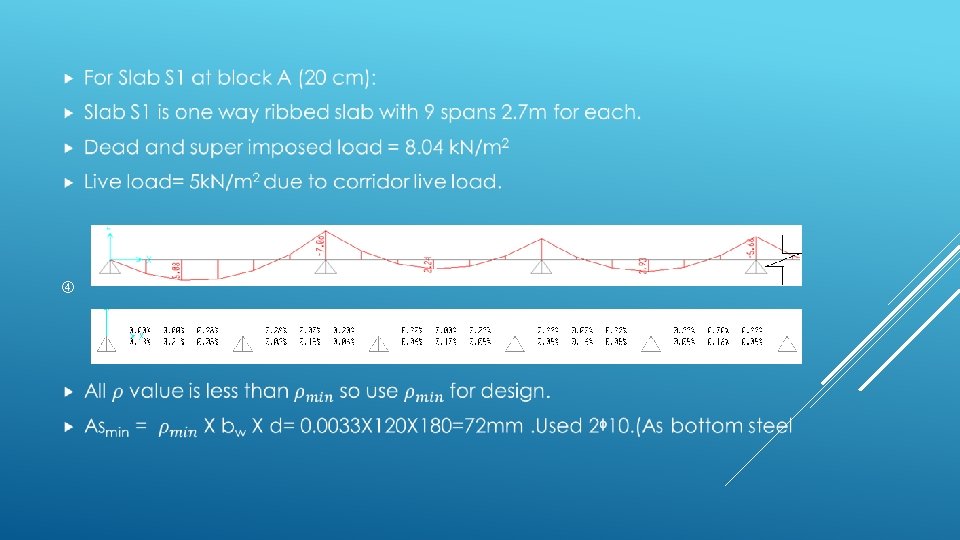 SLAB DESIGN The maximum span length is about 2. 7 m as shown in Block A, B Map, and therefore thickness of the slab (assumed one-way ribbed) according to the table will be L /18. 5 =15 cm and we used 20 cm for block A& B(S 1).