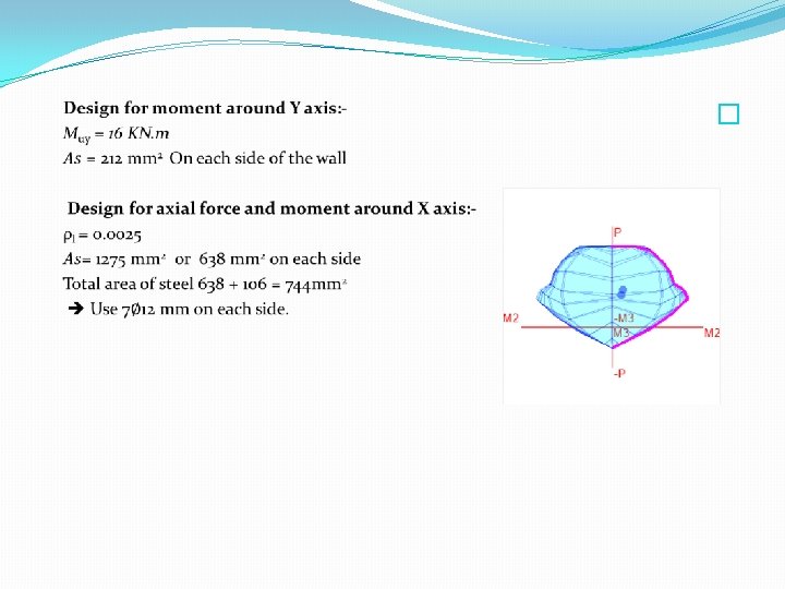 Designing the Column under axial force and moment: The Ultimate forces on the column: Pu= 2351 KN. Mu= 59 KN. m < Mmin= Pu (0. 015+0. 03 h) = 2351 * (0. 015 + (0. 03*0. 8)) = 91. 69 KN. m Use M = 91. 69 KN. m An-najah National university