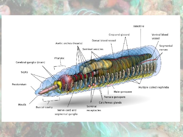 • Oko 12000 vrsta • Naseljavaju slane i slatke vode, zemljište, neke su ektoparaziti kičmenjaka i beskičmenjaka. • Veličina: od nekoliko mm do preko 3 m (džinovske australijske zemljišne gliste) • Metamerno, homonomno segmentisano telo je građeno od segmenata (članaka, prstenova, anulusa)- člankoviti, prstenasti crvi • Metameran raspored većine organa u segmentima • Telo: glava, segmentisani trup i pigidijum • Glavu čine prostomijum (mozak i čulni organi) i peristomijum (usni otvor) • Trup podeljen septama na međusobno slične segmente, celomska duplja podeljena na pojedinačne celomske meškove • Na pigidijumu se nalazi analni otvor • Obuhvata 4 klase: Archiannelida, Polychaeta, Oligochaeta, Hirudinea
