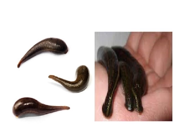 Leeches • Mouth modified into extensible proboscis, or has 3 jaws • Attaches with anterior sucker, bores into host • salivary glands secrete anticoagulant (hirudin) • Muscular pharnyx pumps body fluids of prey, leech gorge themselves, increase 2 to 10 times • Attracted to temperature (mammals) or extracts of prey tissue