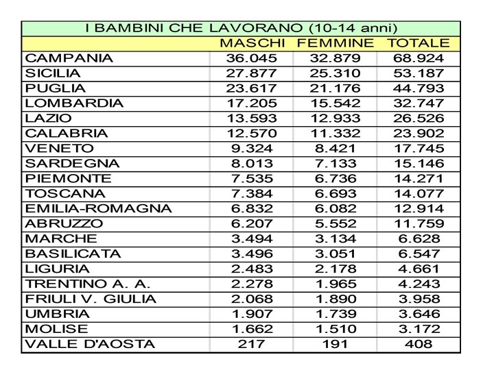 ORA SAPPIAMO CHI SONO, DOVE SONO, CHE COSA FANNO, IN QUALI CONDIZIONI E PERCHÉ LAVORANO CHI SONO: sono oltre 400. 000 hanno un’età compresa fra gli 11 e i 14 anni DOVE SONO: sono nascosti nel Sud più povero, ma anche nel Nord-Est più opulento