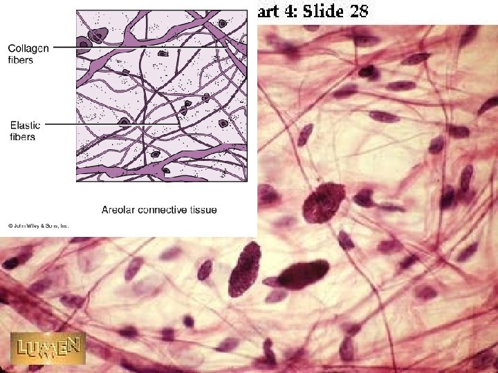 LOOSE Connective Tissue: 1. Areolar CT – consists of all 3 types of fibers, several types of cells, and semi-fluid ground substance – found in subcutaneous layer and mucous membranes, and around blood vessels, nerves and organs – function = strength, support and elasticity