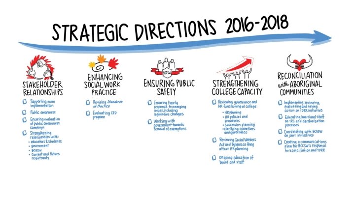 Stakeholder Relationships - Supporting exam implementation public awareness ensuring evaluation of public awareness campaign strengthening relationships with stakeholders Reconciliation - Implementing, reviewing, evaluation & taking action on TDRR initiative - Educating board & staff - Coordinating with BCASW - Creating a communications - plan for BCCSW response to reconciliation and TDRR Enhancing Social Work Practice Revising Standards of Practice Evaluating CPD program Ensuring Public Safety Ensuring timely response to emerging issues - Working with governmentremoval exemptions Strengthening College Capacity - Reviewing governance and HR functioning - Reviewing Social Workers Act and Bylaws - HR planning - Ongoing education of board and staff