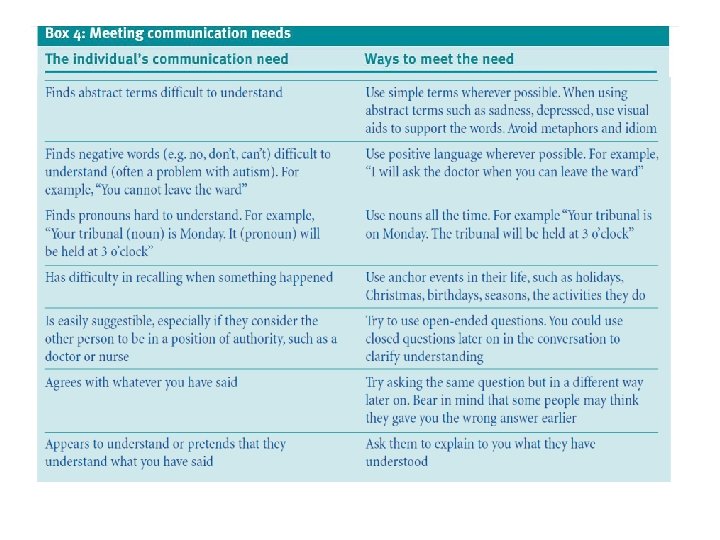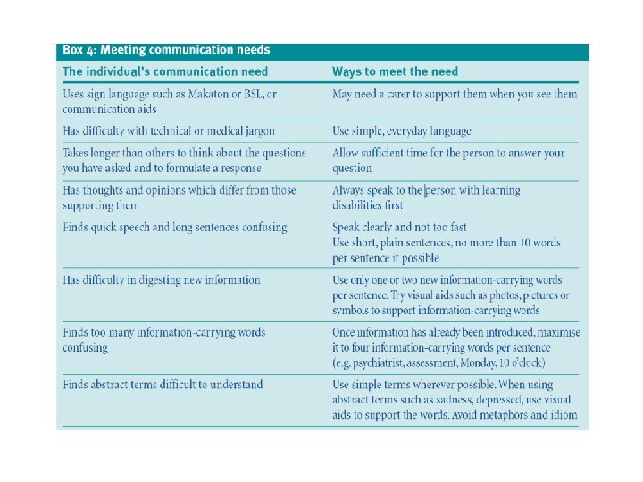 Working with families and support networks • • • Address language barriers Understanding of cultural practice and religious beliefs Role of a person with intellectual disability in the family Hierarchical structures in some cultures Financial impacts Burden of care • http: //www. gmc-uk. org/learningdisabilities/351. aspx