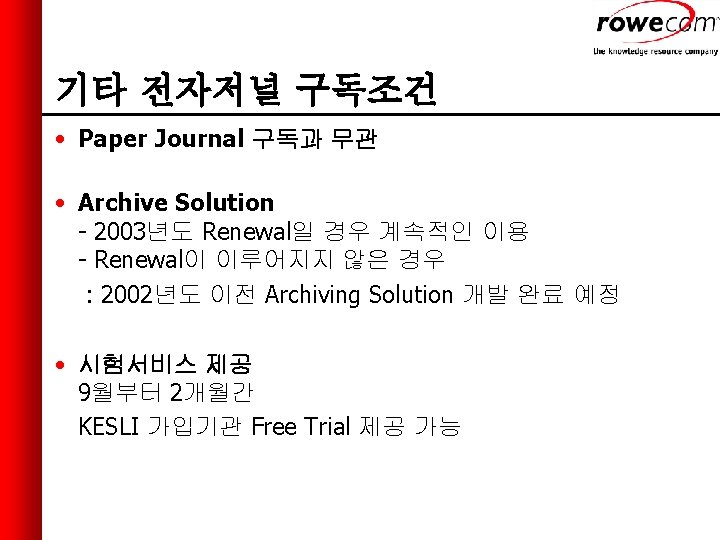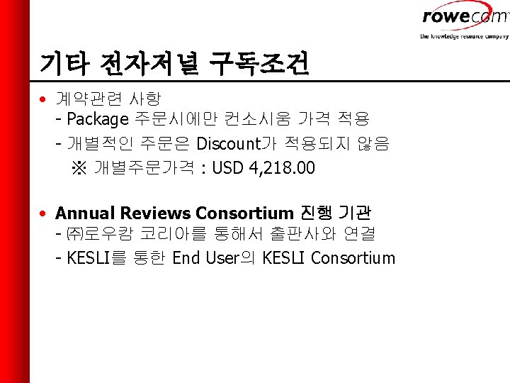 기타 전자저널 구독조건 • Consortium과는 별도로 각 분야별 On-line Suite 및 저널별 구매 가능 - Biomedical Sciences Suite USD 2, 731. 00 - Physical Sciences Suite USD 1, 450. 00 - Social Sciences Suite USD 895. 00