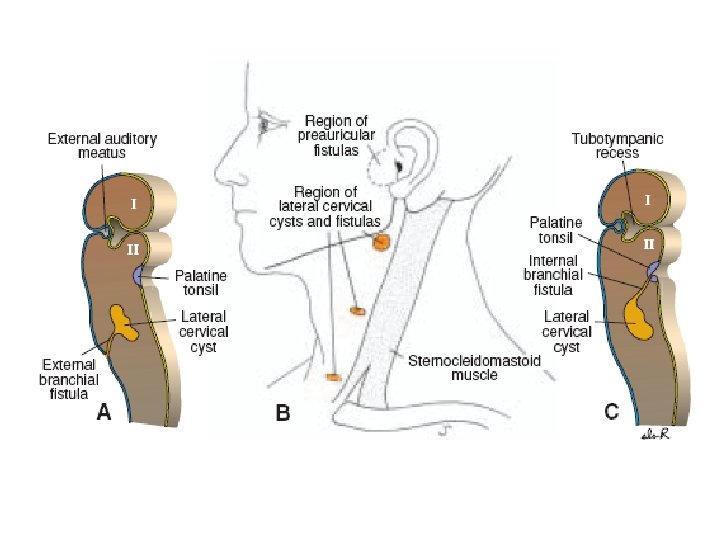 Branchial Fistulas • occur when the second pharyngeal arch fails to grow caudally over the third and fourth arches, leaving remnants of the second, third, and fourth clefts in contact with the surface by a narrow canal. • Such a fistula, found on the lateral aspect of the neck directly anterior to the sternocleidomastoid muscle.