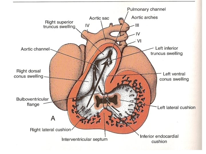 • (Easy Go) • Septation of the truncus arteriosus and conus cordis: • During the 5 th week, two swellings develop in the truncus arteriosus as a Rt superior and Lt inferior swellings. Similar swellings appear in the conus cordis as Rt dorsal and Lt ventral swellings. These four swellings grow toward each other in a spiral way to separate the aorta from the pulmonary artery by a spiral septum that is connected with the septum derived from the conus swellings separating the out flow (smooth part) of the Lt and Rt ventricles. Tubercles of the semilunar valves develop inside the truncal swellings forming the semilunar valves.