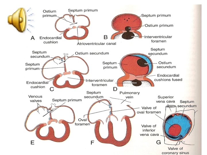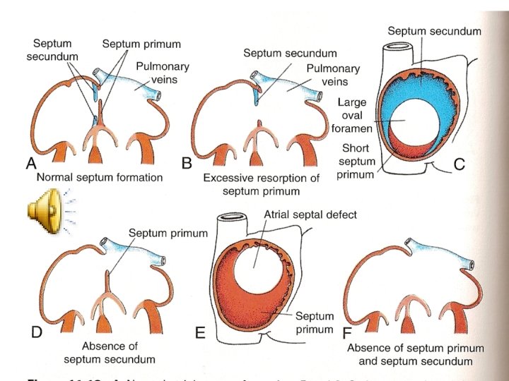 • Anomalies of the interatrial Septation: • There are many types of defected atrial Septation with Rt to Lt shunt of blood: • 1. ostium secondum defect: either by a large ostium secondum formation, or small septum secondum. • 2. ostium primum defect: by abnormal endocardial cushions closing the ostium primum. • 3. complete absence of the septum: common atrium is formed and is called triloculare biventriculare. • 4. premature closure of the foramen ovale (before birth): leading to increased pressure and hypertrophy of the Rt atrium and ventricle, with atrophy of the left atrium and ventricle. It causes death shortly after birth.