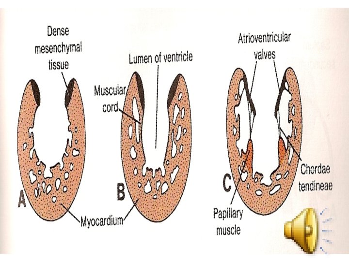 • (Easy Go) • Ventricular Septation: • After the 4 th week, the lateral walls of both ventricles grow on the outside and absorbed from the inside forming the trabeculae carnae and papillary muscles. The medial walls of both of the ventricles fail to grow and thus become opposed and fused with each other forming the muscular interventricular septum. The opening between the upper free end of this septum and the endocardial cushions is closed by the membranous interventricular septum that is derived from the inferior cushion. In addition, the conus and truncus swellings will contribute to the interventricular septum.