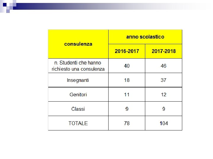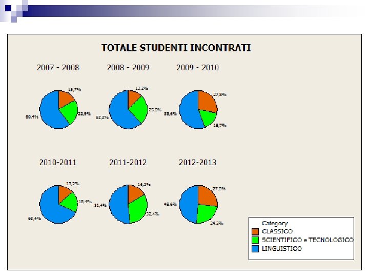 LICEO CORRADINI DATI SULL’ATTIVITA’ PASSATA (dati riferiti al periodo aprile 2007 -maggio 2013 compreso): N. totale studenti incontrati nel corso degli anni: 293 Colloqui totali con studenti: 537 Colloqui totali con gli insegnanti: 42 Colloqui totali con genitori: 50 Totale interventi in classe: 15 Classi in cui c’è stata la presentazione del Servizio: 69
