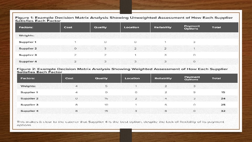 Step 3: Choose the Best Option By now, the organization will have an idea which option best suit its operations. It can make sure it really is the best one with one last step: use Decision Matrix Analysis to weigh up the different factors in each option, and make the best choice.