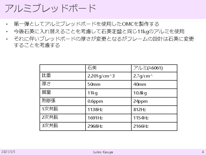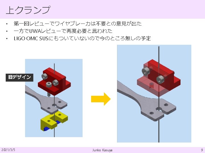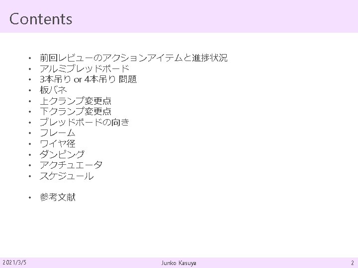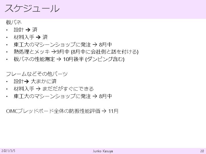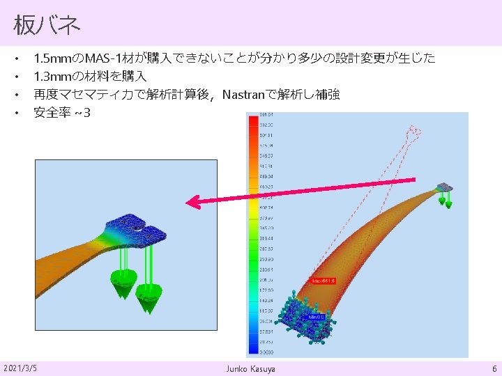 板バネ まとめ 2021/3/5 Material MAS-1 Mass 4. 3 kg Length 220 mm Width ~52. 5 mm @bottom Thickness 1. 3 mm Initial angle 45 deg Radius of blade 190 mm Number of blade 3 Working stress 661 MPa Resonant freq. 2. 23 Hz Junko Kasuya 8
