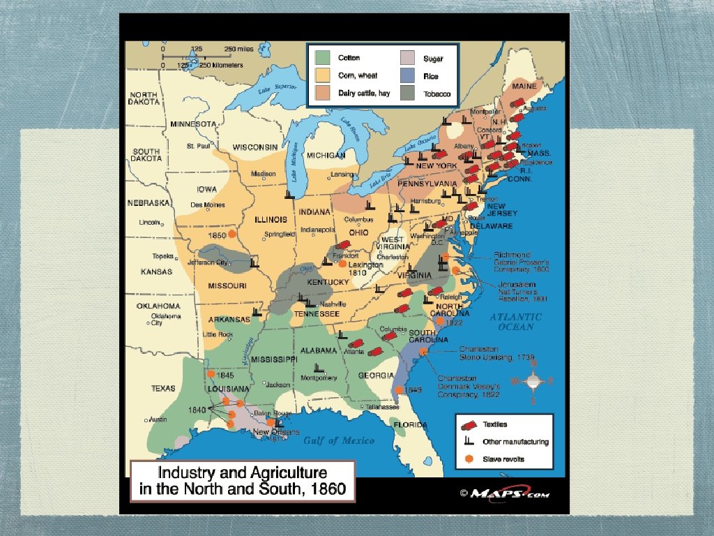 The South • Cotton Kingdom • economy was based on agriculture; mainly • cotton, rice, tobacco