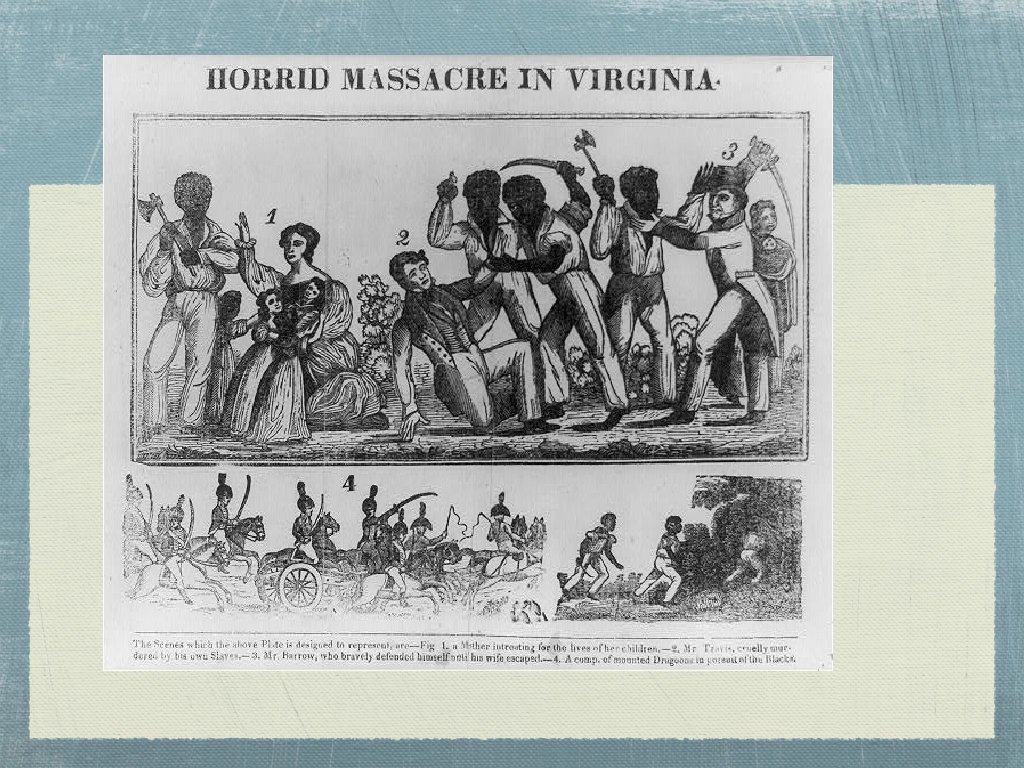 Nat Turner’s Rebellion • 1831, Turner led rebellion killing his owner and 60 whites in the area. • Turner was hunted down and hanged • Frightened whites passed black codes • laws forbidding blacks to gather or be educated
