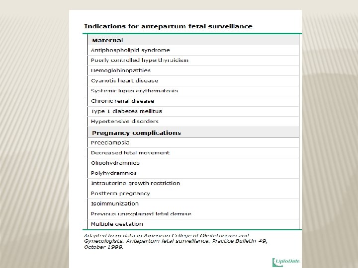 CONDITIONS ASSOCIATED WITH INCREASED PERINATAL MORBIDITY/MORTALITY Small for gestational age fetus Decreased fetal movement Postdates pregnancy (>294 days) Pre-eclampsia/chronic hypertension Pre-pregnancy diabetes Insulin requiring gestational diabetes Preterm premature rupture of membranes Chronic (stable) abruption