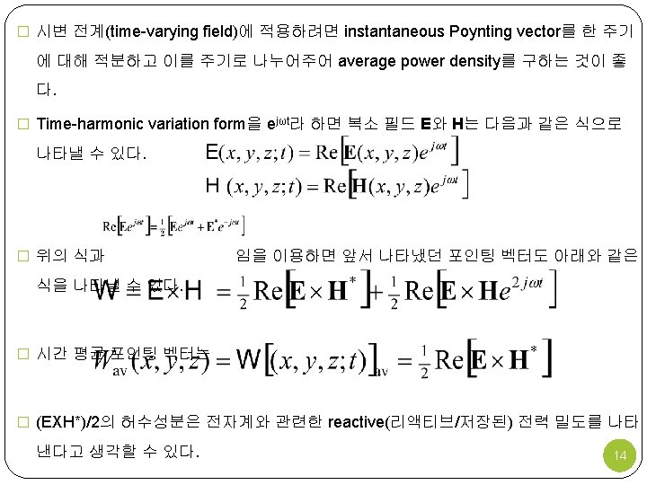 2. 3 Radiation Power Density � 전자파는 무선 매질이나 도파구조를 통해 정보를 전달하는데 사용된다. � 전자파와 관련된 전력을 나타낼 때 사용되는 양은 instantaneous Poynting vector로 아래와 같이 정의된다. � W = instantaneous Poynting vector (W/m 2) � E = instantaneous electric-field intensity (V/m) � H = instantaneous magnetic-field intensity (A/m) � 포인팅 벡터는 전력밀도이기 때문에 폐곡면을 지나는 total power는 포인팅 벡터의 수직 성분을 전체 표면에 대해 적분하여 구할 수 있다. � P = instantaneous total power (W) � = unit vector normal to the surface � da = infinitesimal area of the closed surface (m 2) 13