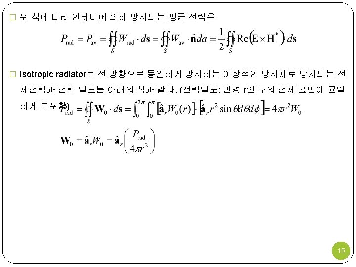 � 전체 전력은 radiation intensity를 전체 입체각 4π에 걸쳐 적분하여 구할 수 있다. � Isotropic source U에 대한 radiation intensity는 radiation power density와 마찬가지로 θ, Φ에 대해 무관하다. � Isotropic source에 대한 radiation intensity는 17