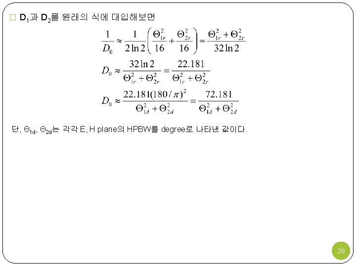 � 직교 편파 성분을 갖는 안테나에 대해 주어진 방향에서 주어진 편파에 대한 안테나의 부분적인 지향성(partial directivity of an antenna for a given polarization in a given direction)은 주어진 편파에 대한 radiation intensity를 전체 방향에 걸쳐 평균한 total radiation intensity로 나눈 값으로 정의한다. � Partial directivity에 대한 정의로부터, 주어진 방향에서의 total directivity는 두 직교편 파에 대한 partial directivity의 합이다. 구좌표계에서 안테나의 직교하는 θ, Φ성분에 대한 total directivity는 다음과 같이 쓸 수 있다. � Uθ = radiation intensity in a given direction contained in θ field component � UΦ = radiation intensity in a given direction contained in Φ field component � (Prad)θ = radiated power in all directions contained in θ field component � (Prad)Φ = radiated power in all directions contained in Φ field component 21