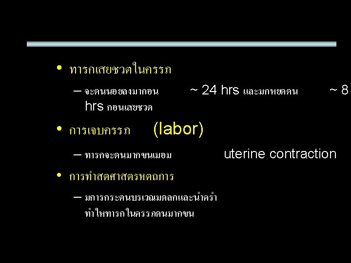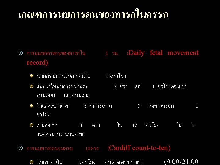 Fetal movement count Principle Indication/ Contraindication All patients in 3 rd trimester of pregnancy Method Interpretation Movement 1. Daily fetal See a doctor when alarming signal movement< 10 record times/ day Decrease fetal movement 24 hr 2. Cardiff count-to then stop -10 No contraindication movement 8 hr before death
