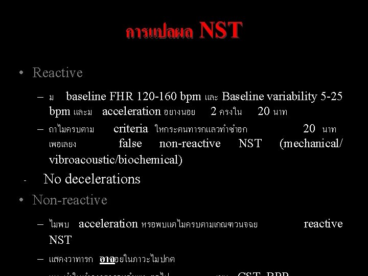 Reading NST Findings: 1. Baseline FHR (120 -160 bpm) 2. Variability 3. Abnormal pattern 4. Periodic change 4. 1 Acceleration 4. 2 Deceleration 5. Uterine contraction