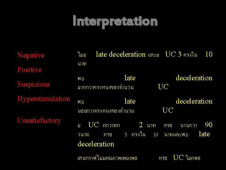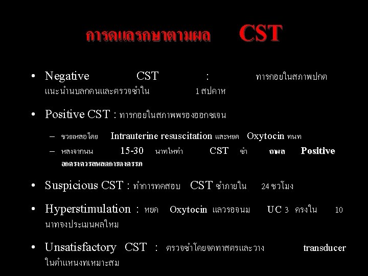 Contraction stress test (CST) Principle Uterine contraction hypoxemia FHR Indication/ Method Contraindication Nonreactive NST 1. OCT 2. Nipple Contraindication stimulation test (See next slide) Interpretation 1. Negative 2. Positive 3. Suspicious 4. Hyperstimulation 5. Unsatisfactory