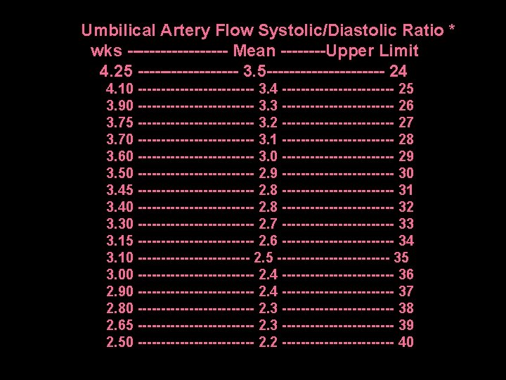 Interpretation • Umbilical systolic-diastolic ratio (S/D ratio) • Ratio >3 at GA > 37 weeks = abnormal • More severe – Absent end-diastolic flow – Reversed end-diastolic flow UPI ↓ ������� ↓ ����� Diastolic↓