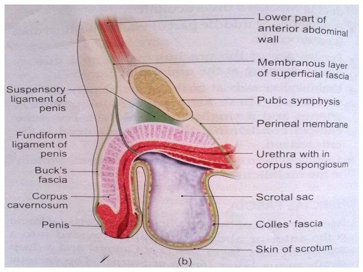 SUPERFICIAL FASCIA CAMPER’S FASCIA: Superficial fatty layer Continuous with the fascia of thorax and thigh Penis devoid of fat In scrotum it is replaced by dartos muscle SCARPA’S FASCIA: Deep membranous layer Continuous as colles’ fascia