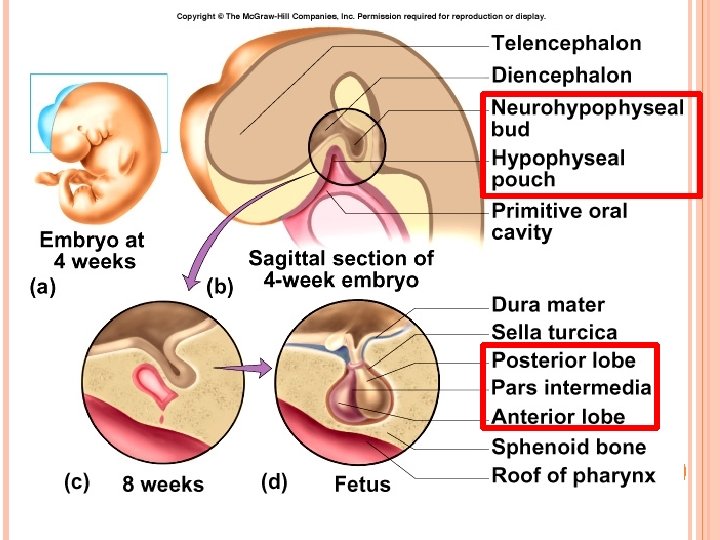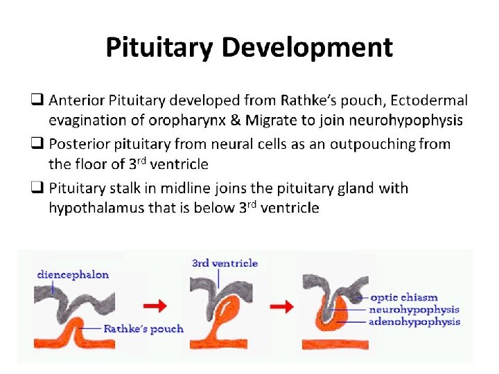§ PITUITARY GLAND (HYPOPHYSIS) Suspended from hypothalamus by stalk (infundibulum) Location and size � housed in sella turcica of sphenoid bone � 1. 3 cm diameter Adenohypophysis (____ pituitary) � arises from hypophyseal (Rathke’s) pouch (outgrowth of pharynx); Neurohypophysis � arises (____ pituitary) from brain; � Magnocellular neurons– supraoptic and paraventricular nuclei; Nerve endings?