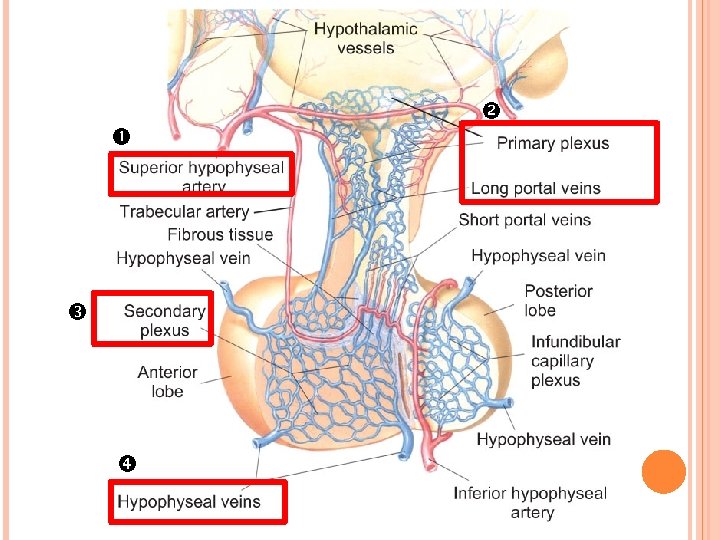 Neurosecretory neurons Hypothalamus Hypophysiotropic H. : ●● 1 Systemic arterial inflow 2 Anterior pituitary Hypothalamic-hypophyseal portal system 3 System 6 venous outflow 4 Posterior pituitary 5 Anterior pituitary hormones: •