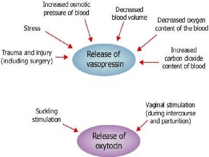 KEY: A a) b) c) d) It is thought that the secretion of antidiuretic hormone (ADH)-also called arginine vasopressin (AVP)-and oxytocin by the neurohypophysis is regulated in the hypothalamic supraoptic and paraventricular nuclei, respectively. ACTH is controlled by POMC from hypothalamus Growth hormone is controlled by GHRH from the hypothalamus TSH is controlled by TRH from the hypothalamus