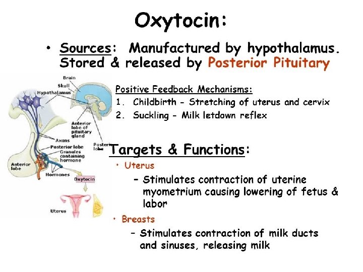 KEY: C: OXYTOCIN a) b) c) d) ADH is also called arginine vasopressin. It's a hormone made by the hypothalamus in the brain and stored in the posterior pituitary gland Growth hormone (GH), also called somatotropin or human growth hormone, peptide hormone secreted by the anterior lobe of the pituitary gland. The two main actions of oxytocin in the body are contraction of the womb (uterus) during childbirth and lactation. Prolactin is mainly used to help women produce milk after childbirth. It's important for both male and female reproductive health