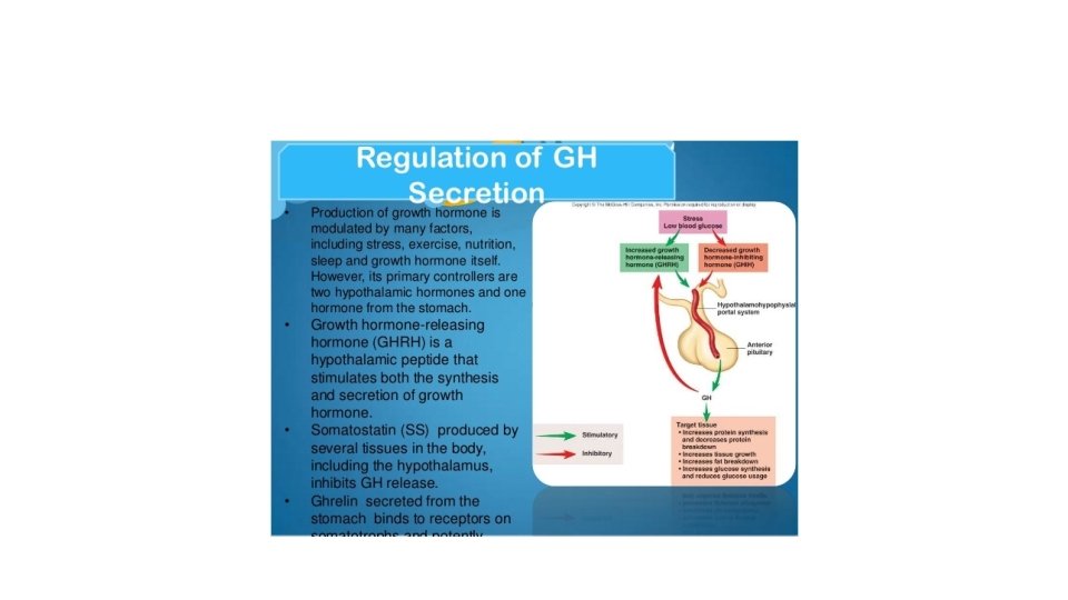 Regulation of Growth Hormone Secretion • GH secretion controlled primarily by hypothalamic GHRH stimulation and somatostatin inhibition • Neurotransmitters involved in control of GH secretion– via regulation of GHRH and somatostatin