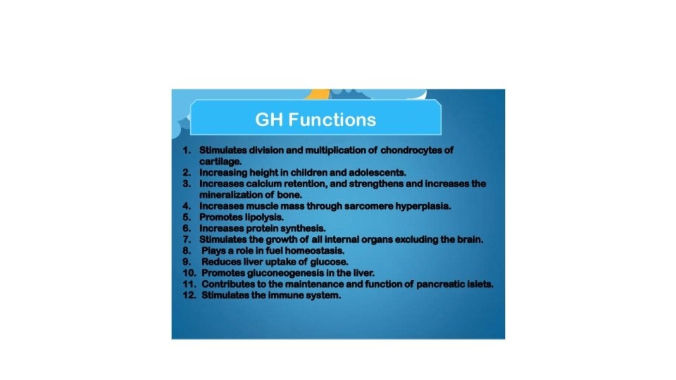 Biochemical actions 1. GH increases protein synthesis 2. Carbohydrate metabolism: GH antagonizes the effects of insulin (hyperglycemia); decreased peripheral utilization of glucose, increased hepatic production via gluconeogenesis 3. Lipid metabolism: GH promotes the release of free fatty acids and glycerol from adipose tissue, increases circulating free fatty acids, causes increased oxidation of free fatty acids in the liver 4. Mineral metabolism: GH promotes a positive calcium, magnesium, and phosphate balance (promotes growth of long bones) 5. Prolactin-like effects Pathophysiology: dwarfism, gigantism, acromegaly