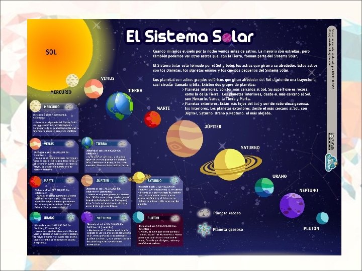 EL SISTEMA SOLAR El Sistema Solar es un conjunto formado por el Sol y los cuerpos celestes que orbitan a su alrededor. Está formado por el Sol y una serie de cuerpos que están ligados con esta estrella por la gravedad: ocho grandes planetas (Mercurio, Venus, Tierra, Marte, Júpiter, Saturno, Urano y Neptuno), junto con sus satélites, planetas menores (entre ellos, el ex-planeta Plutón), asteroides, cometas, polvo y gas interestelar. Pertenece a la galaxia llamada Vía Láctea, formada por miles de millones de estrellas, situadas a lo largo de un disco plano de 100. 000 años luz. El Sistema Solar está situado en uno de los tres brazos en espiral de esta galaxia llamado Orión, a unos 32. 000 años luz del núcleo, alrededor del cual gira a la velocidad de 250 km por segundo, empleando 225 millones de años en dar una vuelta completa, lo que se denomina año cósmico.