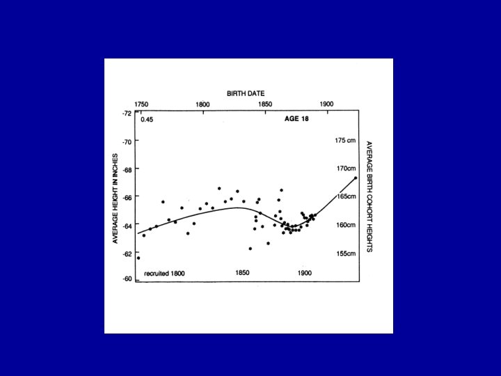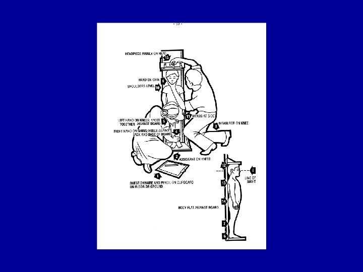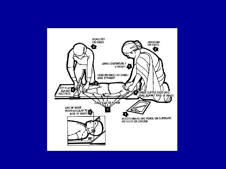 Height • Difficult to measure, accuracy, large variations • Differences are small: 24 cm increment in the first year of life, 11 cm second year, 8 third • Low sensitivity • Large measurement errors • Stunted versus stunting – stunted is a heterogeneous group – stunting is the active process: determinants are acting • Measure to the nearest mm • Below 2 recumbent, above standing