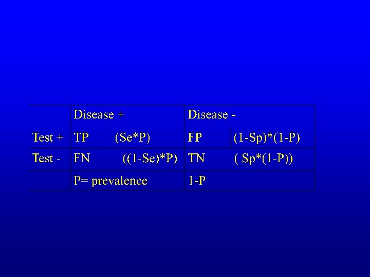 reformulation PPV= TP /TP +FP PPV= Se*P / (Se*P) + ((1 -Sp) * (1 -P)) NPP= TN/FN + TN NPP= Sp(1 -P) / (Sp * (1 -P) + ((1 -Se) * P)