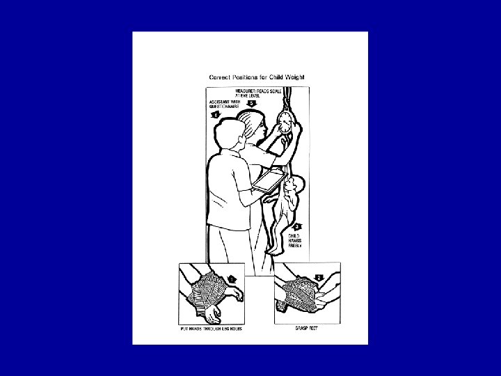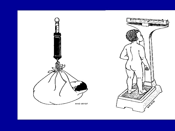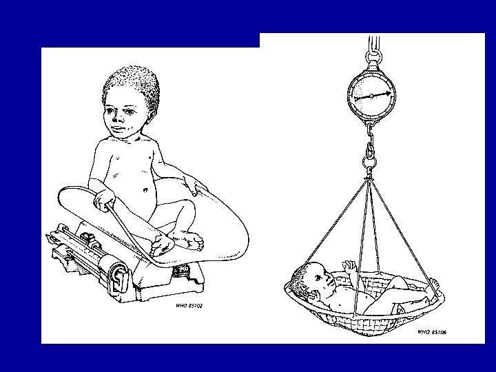 WEIGHT • • • Sensitive to changes Changes in two directions up and down Fast change Usually easy to collect Standardisation of scales needed, calibration Small changes are difficult to measure: food intake of the child, urine, dehydration, temp, etc: not very specific • community aversion: connotations • can be difficult: co-operation of children • to nearest 100 gr.