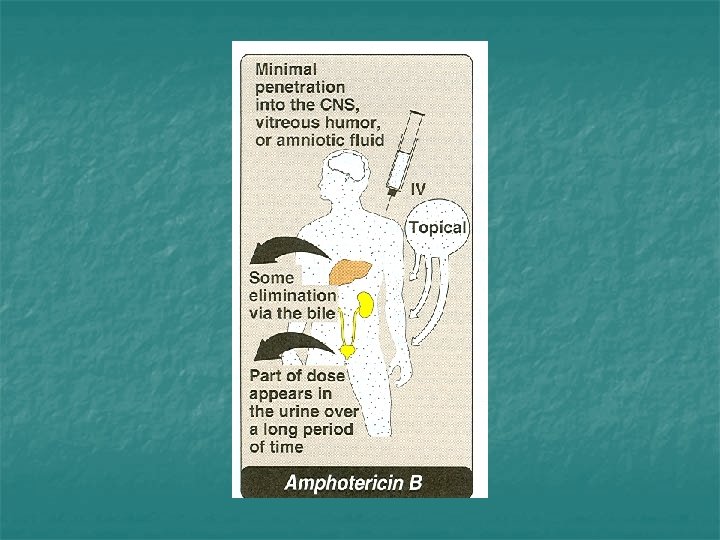 Liposomal preparations of amphotericin B. n To reduce the toxicity of amphotericin B , several new formulations have been developed in which amphotericin B is packaged in a lipid-associated delivery system, to assume that they will less bind to mammalian cell. Lipid vehicle act as a reservoir, reducing binding to human cell. In this way it permits a larger doses, even five times more than colloidal preparation, they have better clearance. n Clinically they have more efficacy , less nephrotoxicity. n But these are very expansive.