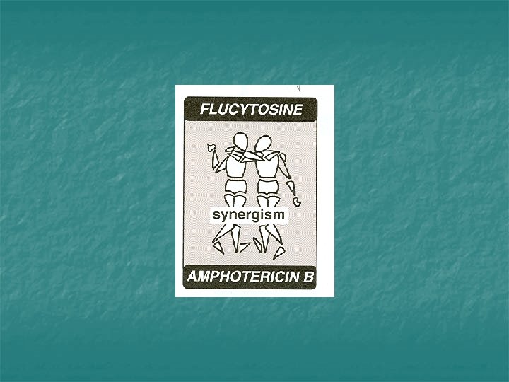 FLUCYTOSINE n Has useful activity against Candida and Cryptococcus. n it is synthetic pyrimidine antimetabolite that is often used in combination with amphotericin B n it is fungistatic, effective in combination with itraconazole for treating chromoblastomycosis and with amphotericin for treating cryptococosis. n Mechanism of action It is converted to antimetabolite 5 -florouracil in a fungal but not human cell. This 5 -FU inhibits thymidylate synthetase enzyme and thus DNA synthesis. Resistant mutants may occur, should never be used alone.