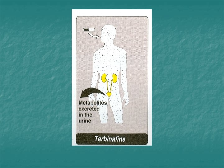 n quite effective for the treatment of onychomycosis 250 mg daily for 6 weeks for finger nail infection and for 12 weeks in toe nail infection n Well absorbed orally , bioavailability decreases due to first pass metabolism in liver. n Protein binding more than 99% in plasma. n Drug accumulates in skin, nails and fat. n severely hepatotoxic , liver failure even death.