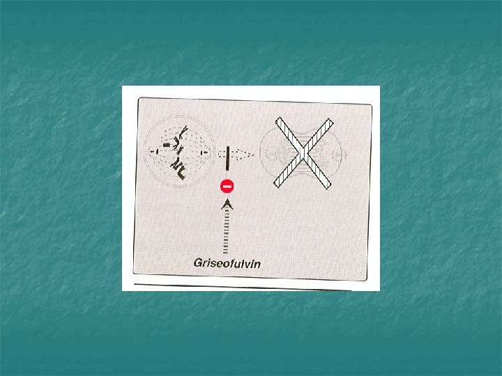 GRISEOFULVIN n n n it has largely been replaced by terbinafine for treatment of dermatophytic infections of the nails. very insoluble in water It is useful for dermatophytes n It is fangistatic for species of dermatophytes. it has narrow spectrum. n Isolated from Pencillium griseofulvum n It interacts with microtubules and interferes with mitosis.