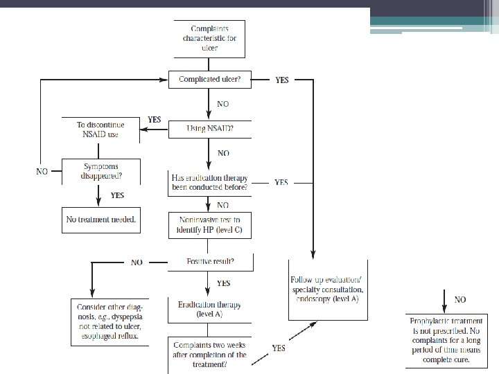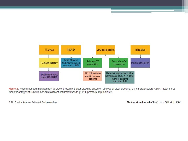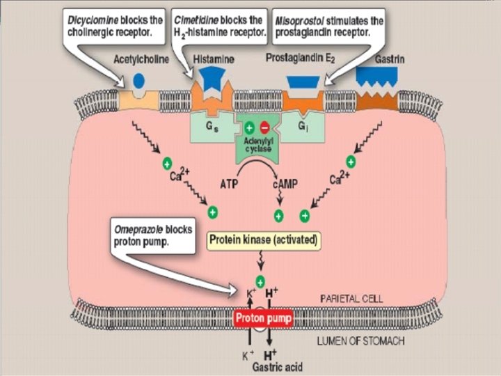 Production of Gastric acid • Secretion of gastric acid, mucus and bicarbonate. The control of the gastrointestinal tract is through nervous and humoral mechanisms. ▫ Acid is secreted from gastric parietal cells by a proton pump (K+/H+ ATPase). ▫ The three endogenous secretagogues for acid are histamine, acetylcholine and gastrin. ▫ Prostaglandins E 2 and I 2 inhibit acid, stimulate mucus and bicarbonate secretion, and dilate mucosal blood vessels. • The genesis of peptic ulcers involves: ▫ infection of the gastric mucosa with Helicobacter pylori. ▫ an imbalance between the mucosal-damaging (acid, pepsin) and the mucosal-protecting agents (mucus, bicarbonate, prostaglandins E 2 and I 2