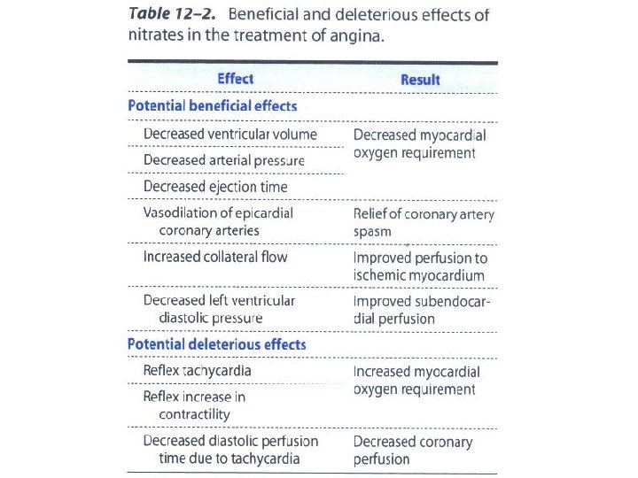 Adverse effects: 1. The most common side effect of nitrates is headache due to venodilation, patients whom intermittently used nitrate preparation should be asked about headaches after nitrate use; lack of headache often indicates degradation of agent with a loss of therapeutic effect. 2. Postural hypotension & syncope particularly with sublingual use. 3. Tachycardia induced by decreased PVR may itself induce anginal symptoms especially with unstable symptoms. 4. Methemaglobinemia can occur with chronic use of long term agents, this may occur when sublingual use is combined with long acting agents. 5. Withdrawal symptoms may occur (an indication of tolerance) when nitrate agents are tapered or discontinued, this may precipitate anginal attacks.