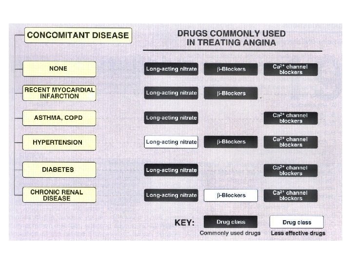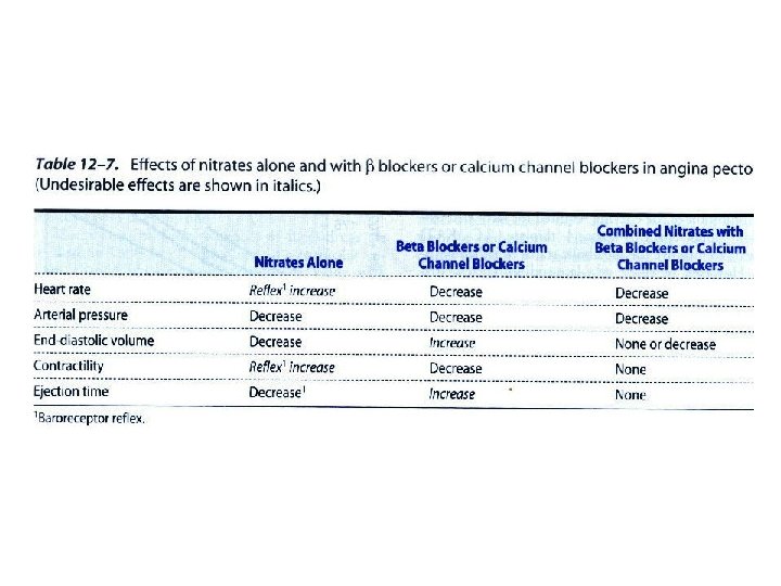 β-Blockers • β-Blockers decrease O 2 demands of the myocardium by lowering the heart rate and contractility (decrease CO) particularly the increased demand associated with exercise. They also reduce PVR by direct vasodilation of both arterial & venous vessels reducing both pre- and after load. These effects are caused by blocking β 1 receptors, selective β 1 antagonists (atenolol, metoprolol and acebutolol) lose their selectivity at high doses and at least partially block β 2 receptors (a concern for bronchospastic disease). • β 1 antagonists reduce the frequency and severity of anginal episodes particularly when used in combination with nitrates. β 1 antagonists have been shown to improve survival in post MI patients and decrease the risk of subsequent cardiac events & complications. There a number of contraindications for β blockers: asthma, diabetes, bradycardia, PVD & COPD. • β-Blockers in combination with nitrtates can be quite effective.